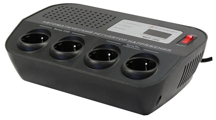 Input voltage type: single-phase, stabilizer type: relay, location: floor, min. input operating voltage: 180 V, max. input operating voltage: 264 V, output sockets with stabilization: 3 pcs., error