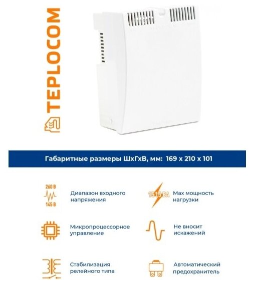 Input voltage type: single-phase, stabilizer type: electromechanical relay, location: floor, wall, min. input operating voltage: 165 V, max. input operating voltage: 260 V, output sockets with