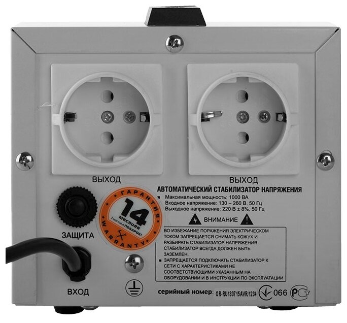 Input voltage type: single-phase, stabilizer type: relay, location: floor, min. input operating voltage: 180 V, max. input operating voltage: 264 V, output sockets with stabilization: 3 pcs., error