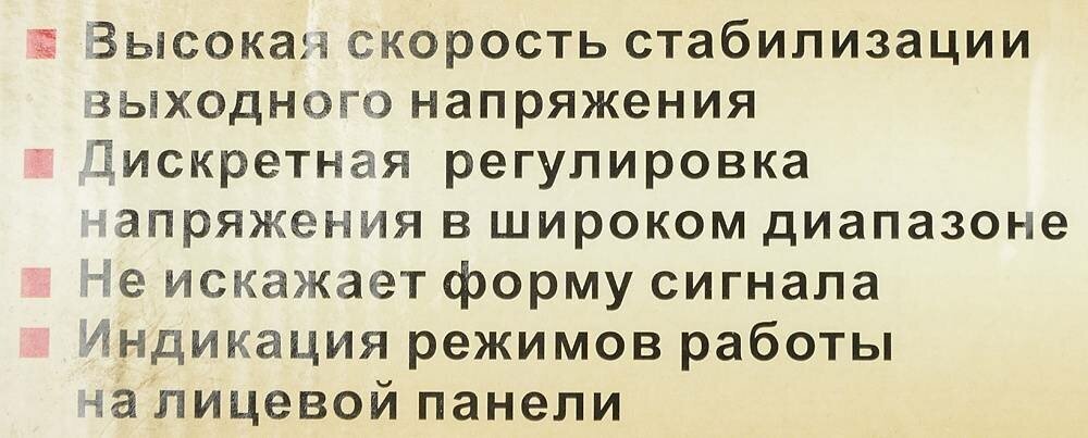 Input voltage type: single-phase, stabilizer type: relay, location: floor, min. input operating voltage: 180 V, max. input operating voltage: 264 V, output sockets with stabilization: 3 pcs., error