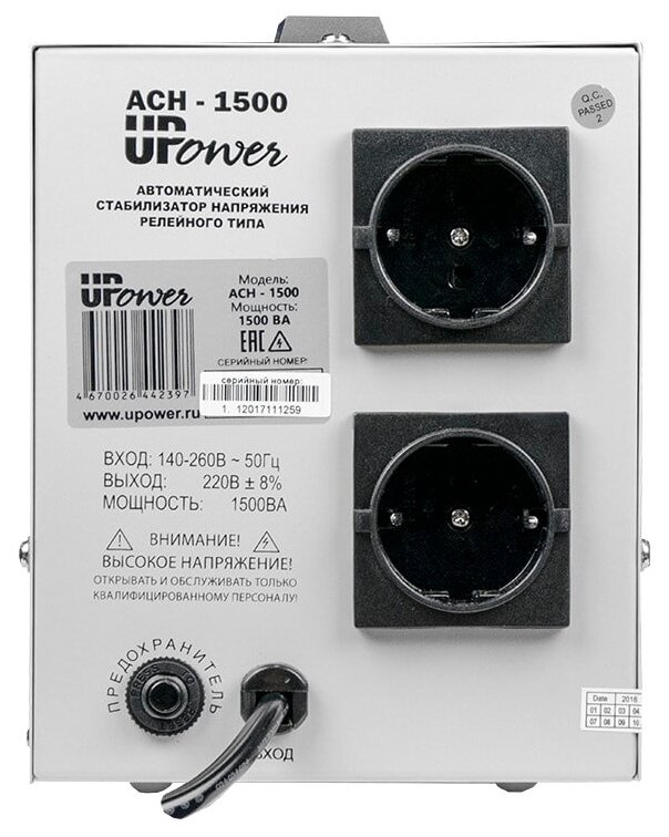 Input voltage type: single-phase, stabilizer type: relay, location: floor, min. input operating voltage: 180 V, max. input operating voltage: 264 V, output sockets with stabilization: 3 pcs., error