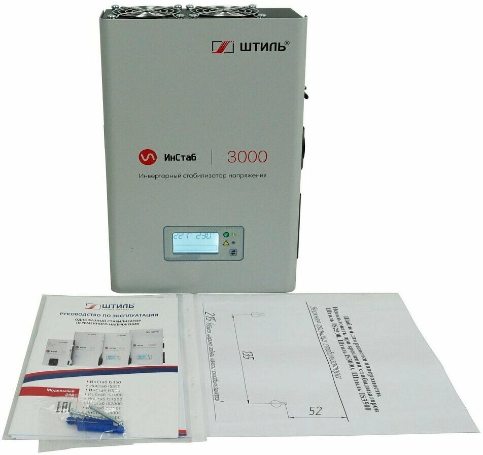 Is3000 voltage stabilizer, mounting bracket with holes, dowel 6x40 - 2 pcs., self-tapping screw 4.2x41 - 2 pcs., self-adhesive rubber instrument foot - 4 pcs., instruction manual, warranty card, packaging
