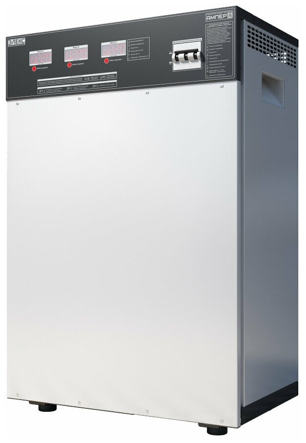 Type of input voltage: three-phase, type of stabilizer: electronic triac, location: floor, min. input operating voltage: 145 V, max. input operating voltage: 275 V, error: 3.50%