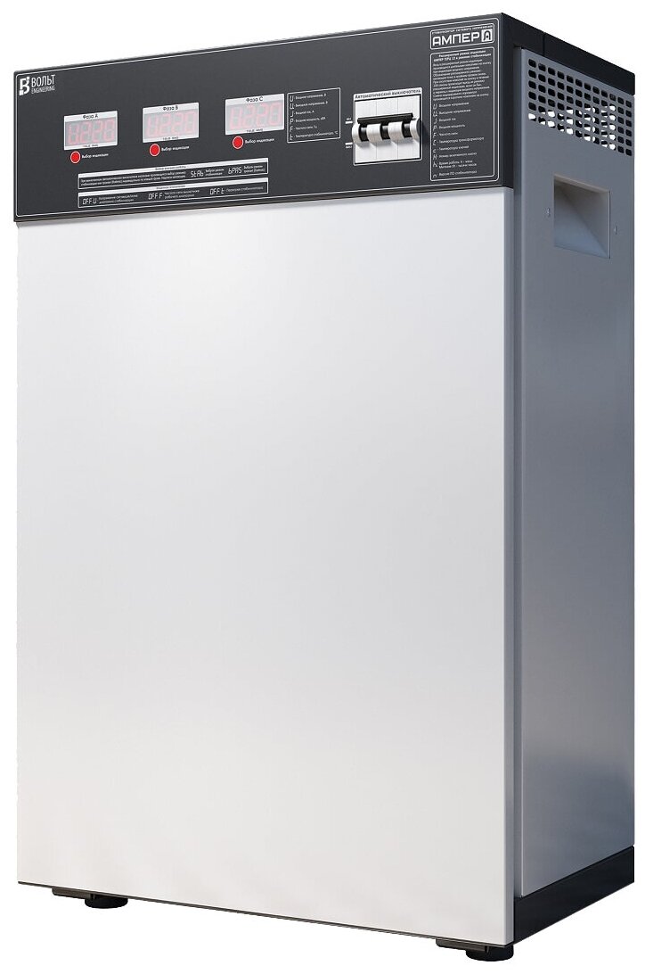 Type of input voltage: three-phase, type of stabilizer: electronic triac, location: floor, min. input operating voltage: 145 V, max. input operating voltage: 275 V, error: 3.50%