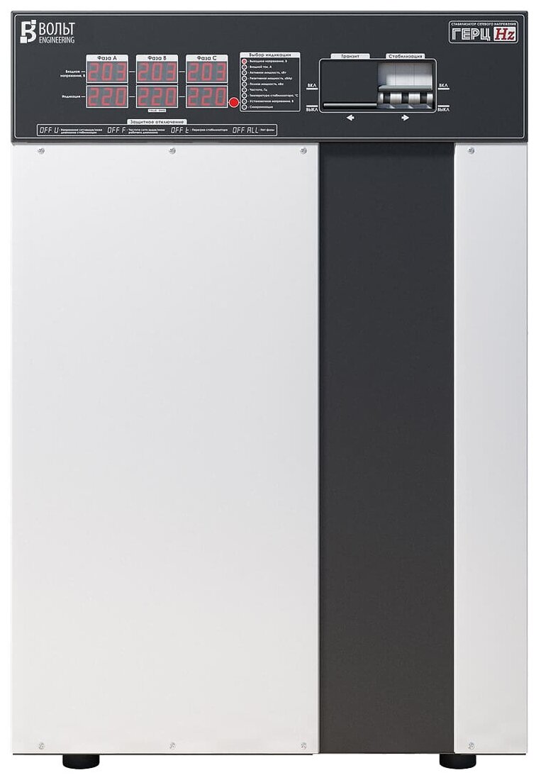 Type of input voltage: three-phase, type of stabilizer: electronic thyristor, location: floor, min. input operating voltage: 150 V, max. input operating voltage: 260 V, error: 2.50%