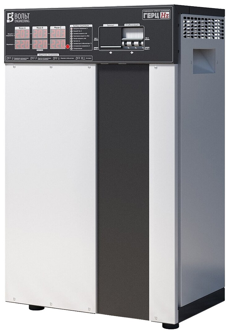 Description: Type of input voltage: three-phase, type of stabilizer: electronic thyristor, location: floor, min. input operating voltage: 150 V, max. input operating voltage: 260 V, error: 2.50%