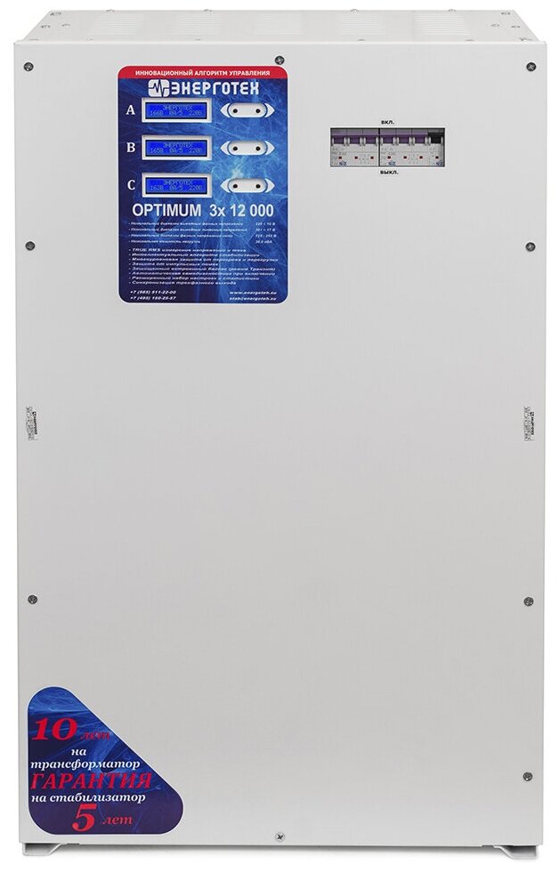Type of input voltage: three-phase, type of stabilizer: electronic thyristor, location: floor, wall, min. input operating voltage: 125V, max. input operating voltage: 260 V, error: 4.30%