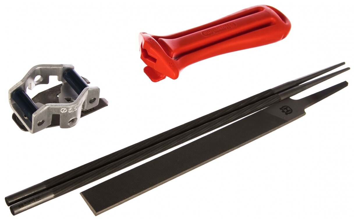 Sharpening set contains file handle, combination or sharpening template and depth gauge, one flat file