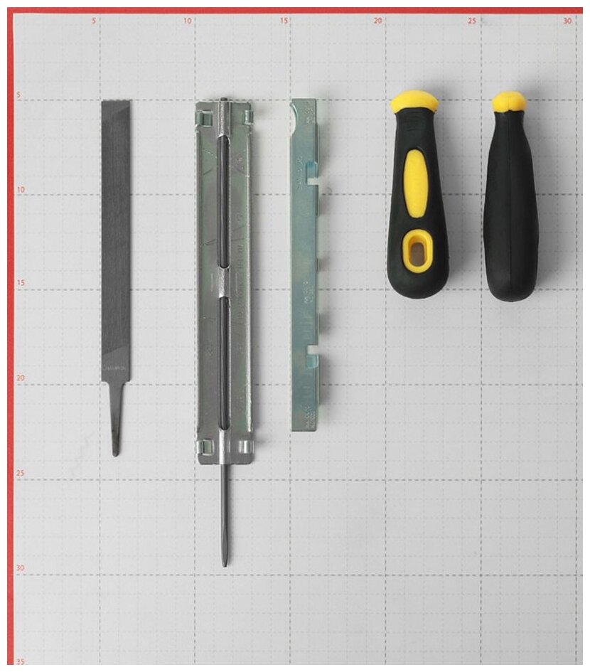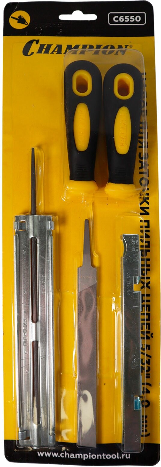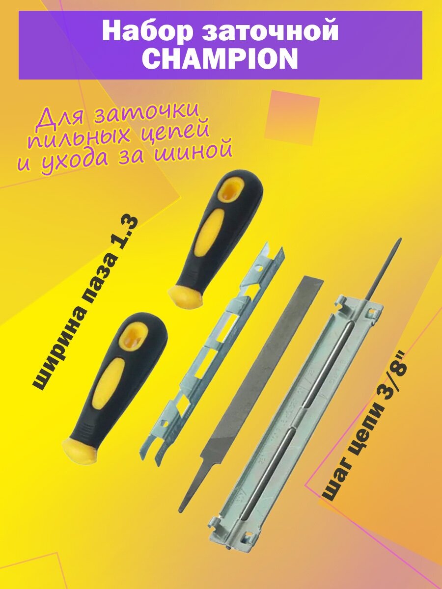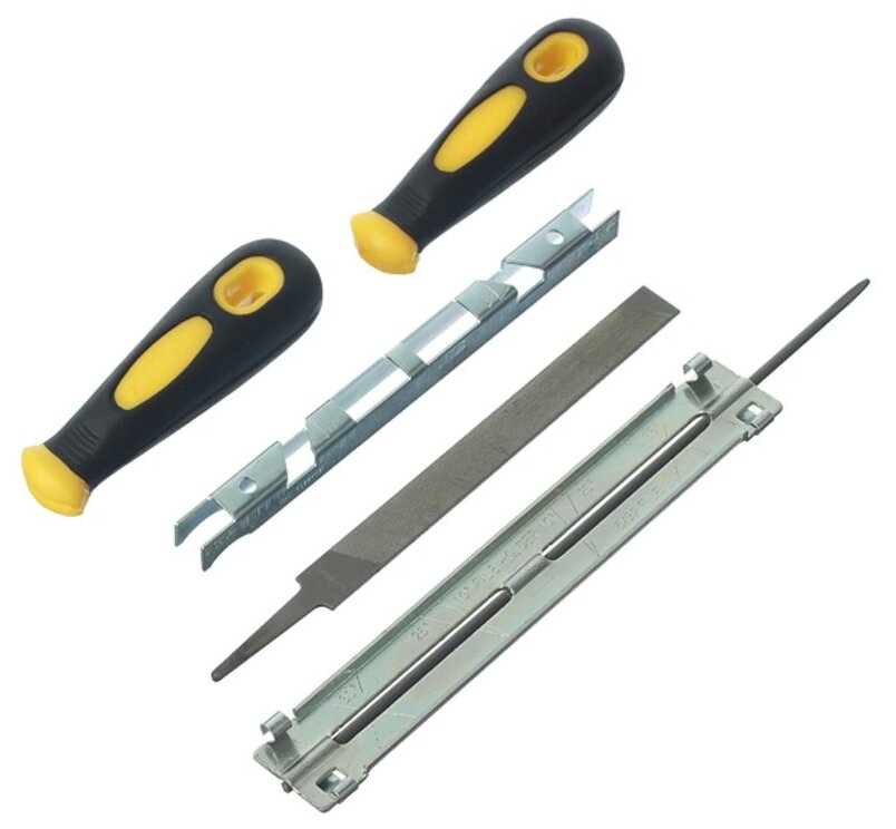 For chains 3/8 with a step of 1.3; complete set: round file - 1 pc., flat file - 1 pc., handles for files - 2 pcs. guide - 1 pc., bar - 1 pc.