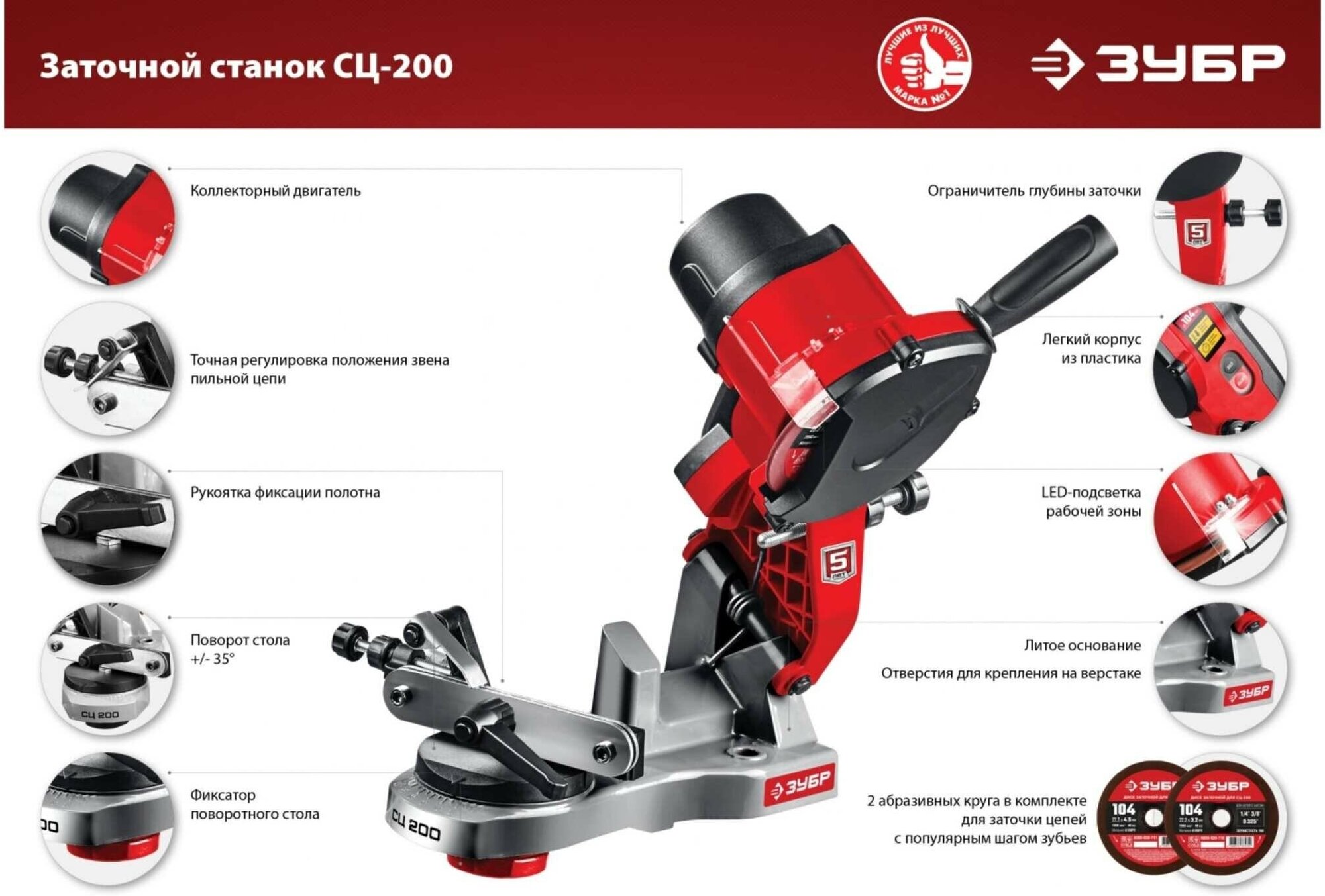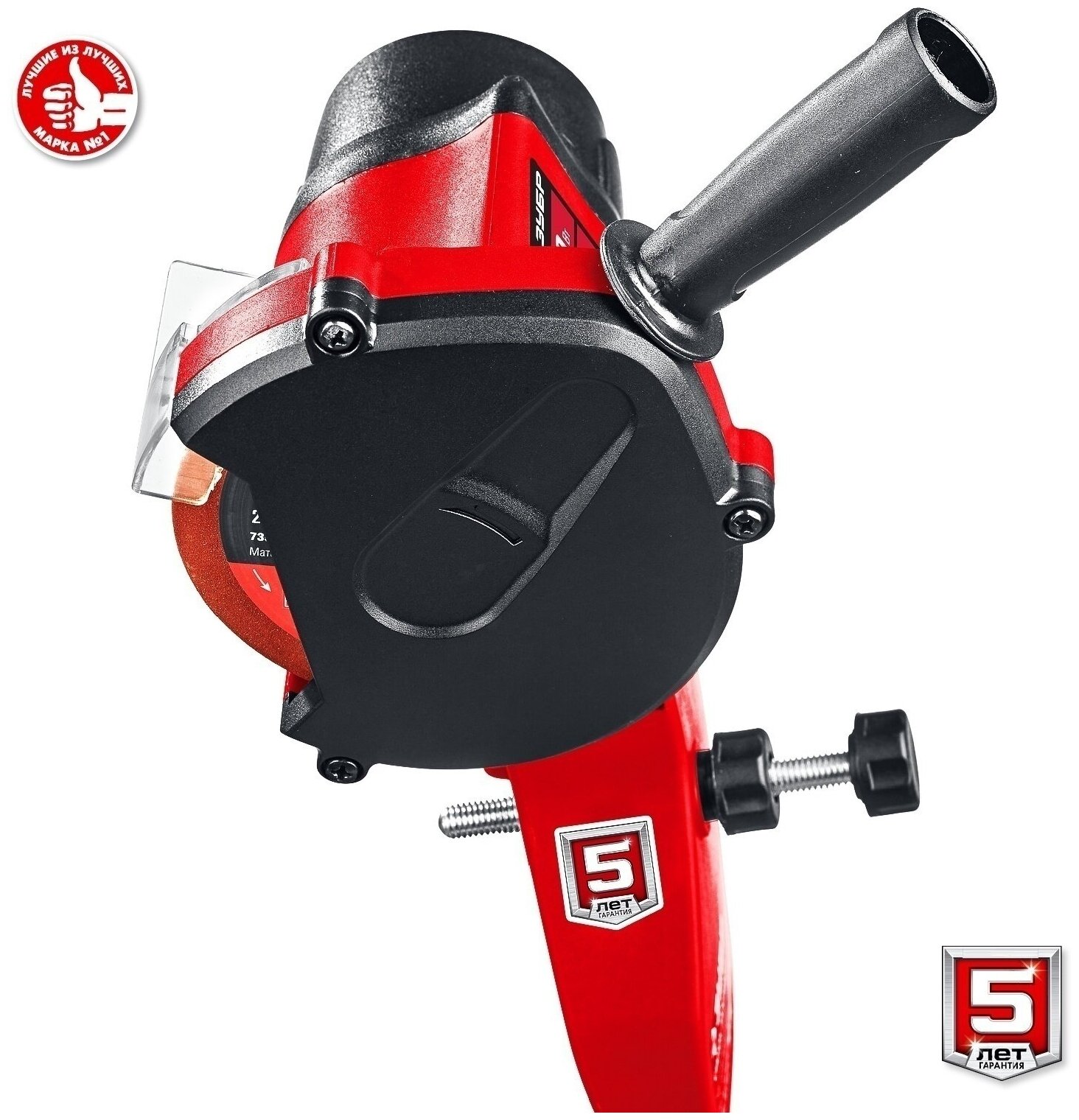 Grinding wheel width, 3.2/4.5 mm, grit 100; supply voltage: ~230/50 V/Hz; engine type: collector; table rotation: -35…35 degrees; head tilt: 55 degrees; sharpening chain types: 1/4 6.35mm, - 3.8 9.3mm low profile, -