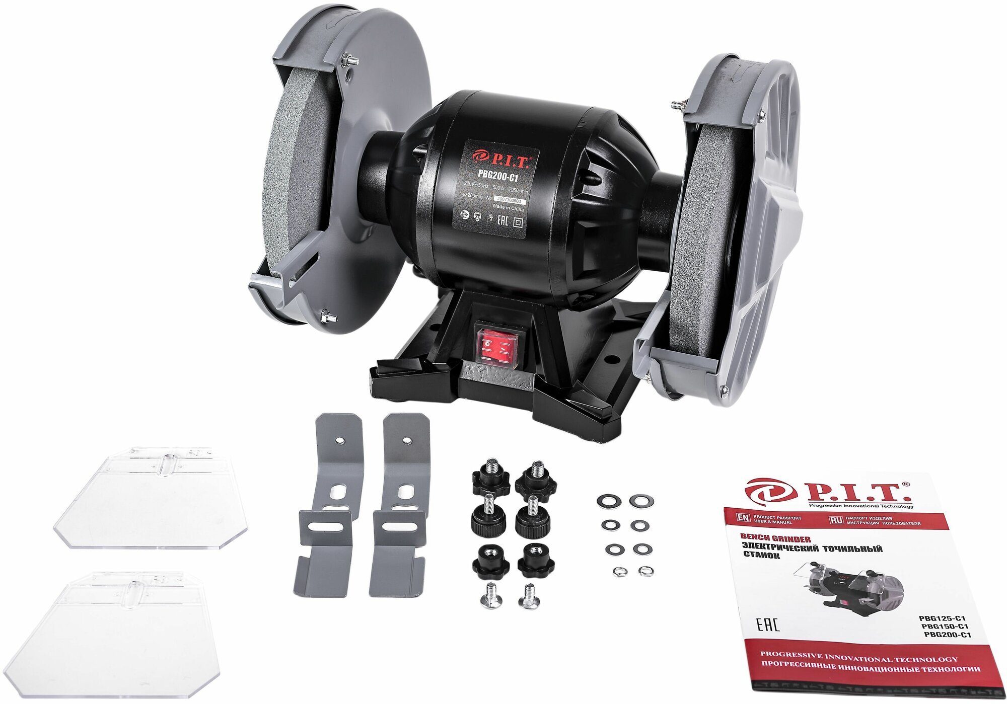 Complete set Grinding machine. Protective screen with mount, 2 pcs. Grinding wheel, 2 pcs. Working platform with mount, 2 pcs. Adapter, 32 mm, 2 pcs. Instruction. Package.