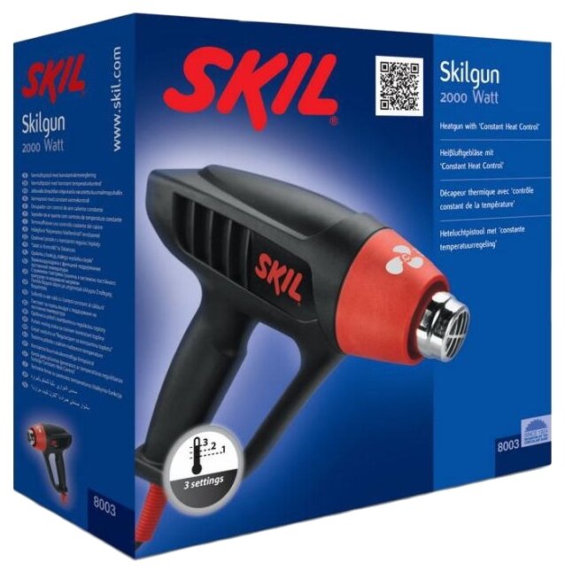3 operating modes - 70 °C, 550 l/min; 450 °C, 350 l/min; 600 °C, 550 l/min; the possibility of stationary use; cable length: 2.8 m; hanging loop