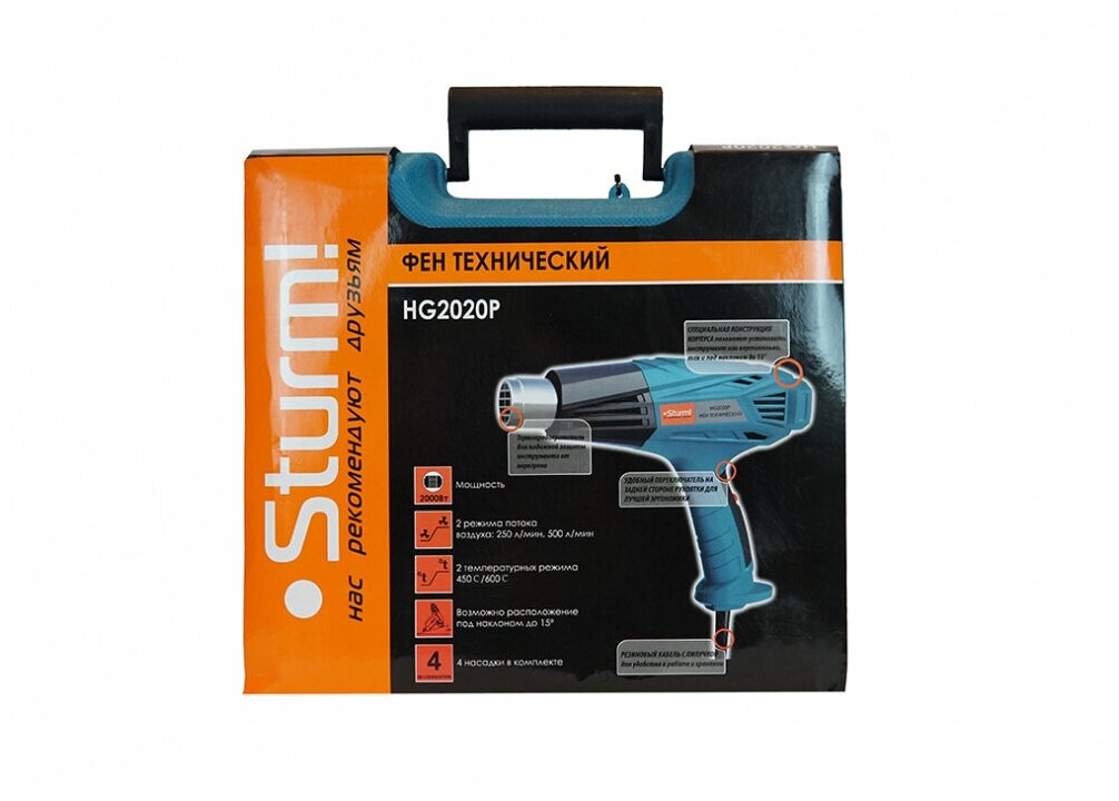 Description: Power: 1500 W, function: pipe defrost, paint removal, temperature control: step, air flow control, minimum operating temperature: 300 °C, maximum operating temperature: 560 °C, area