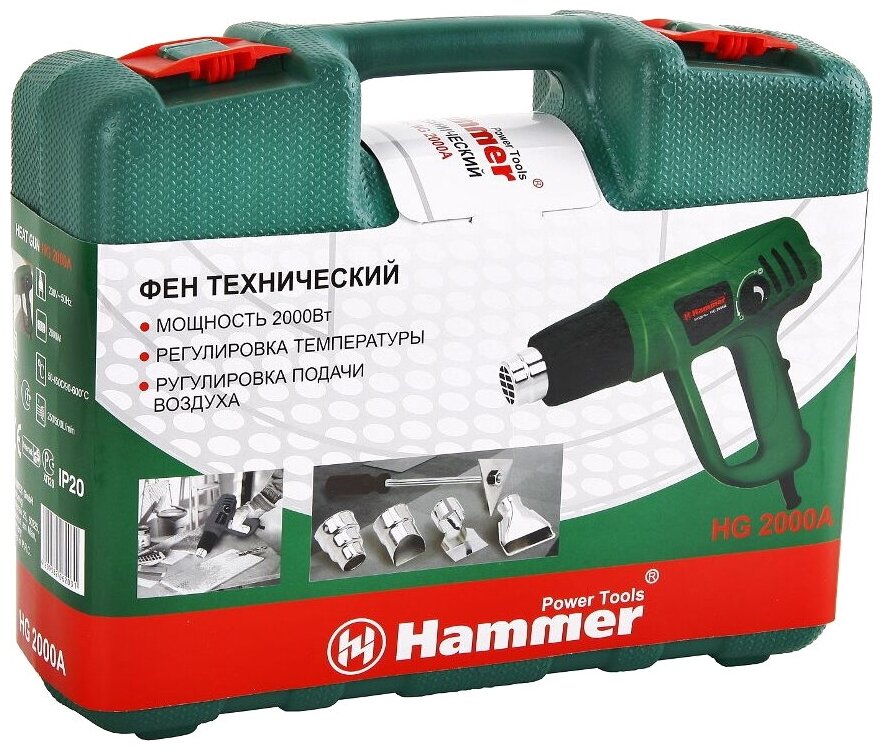 Power: 2000 W, temperature control: stepless, air flow control, nozzles included, minimum operating temperature: 50 °C, maximum operating temperature: 600 °C, application: household, protection against dust