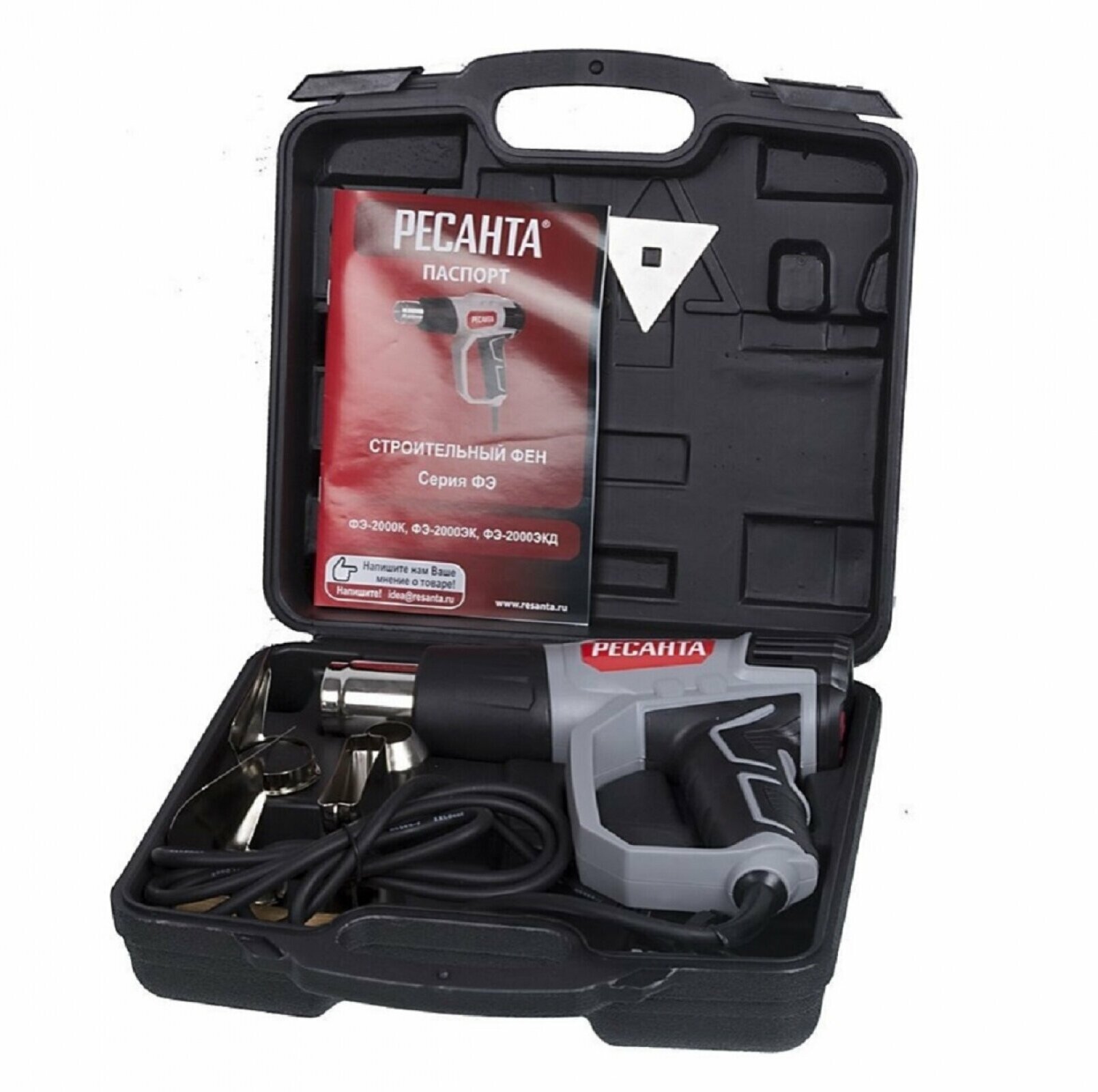 Building hair dryer, nozzles - 4 pcs., a scraper with a triangular blade, passport instruction, packaging