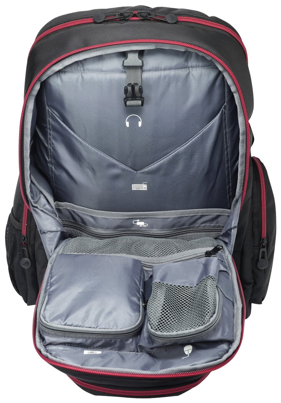 Anti-theft, exterior pocket, bottle pocket, phone pocket, headphone cord opening, organizer compartment, shoulder strap