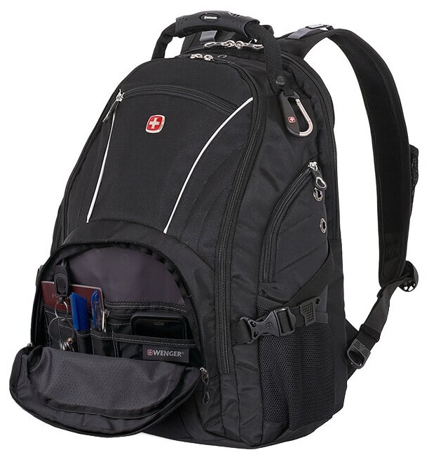 External pocket, water protection, key hook, bottle pocket, phone pocket, headphone cord opening, organizer compartment, shoulder strap