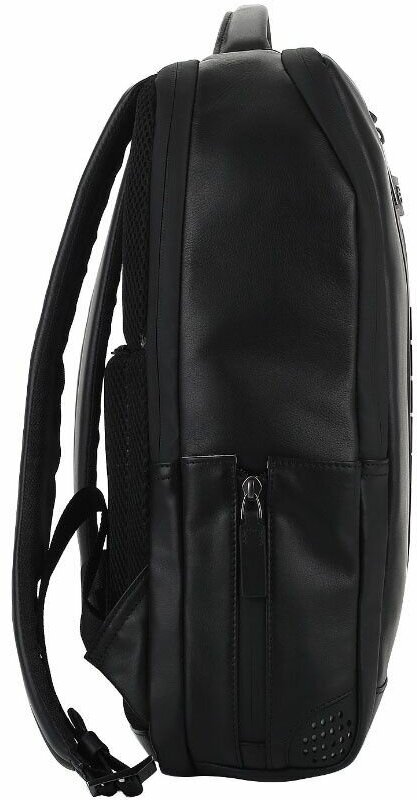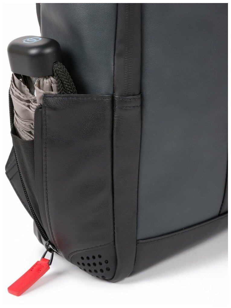 Two compartments, one of which has a compartment for a 15.6-inch laptop and tablet, pockets for a bottle and an umbrella on the sides, a fastening on a travel bag and a zippered pocket on the back, a pocket for plastics on one of the straps