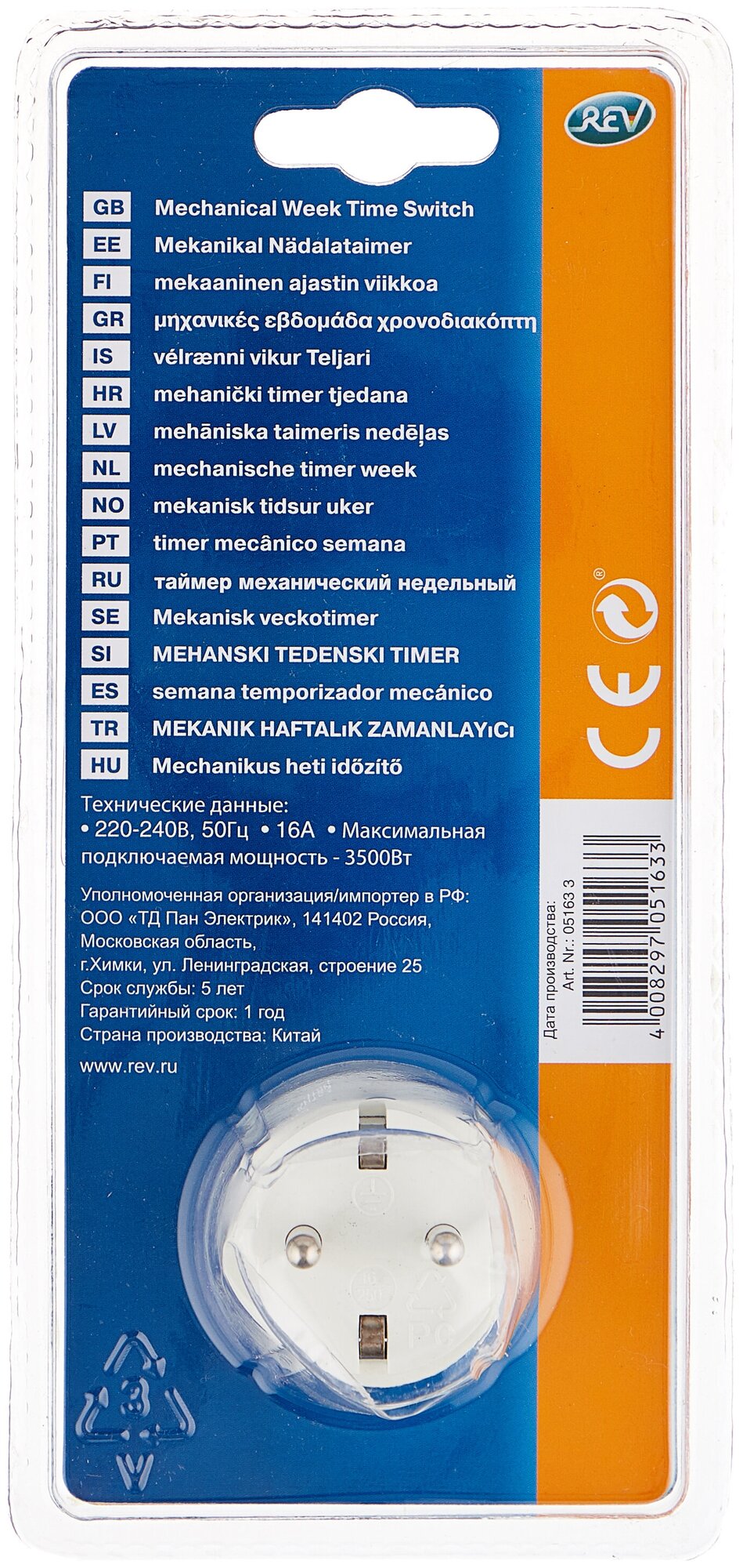 Socket-timer, number of channels: 1, timing: mechanical, maximum load current: 16 A, maximum load power: 3500 W, IP20