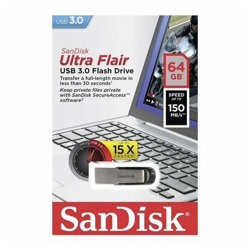 Flash Drive 64 GB, SANDISK Ultra Flair USB 3.0, Silver/Black, SDCZ73-064G-G46