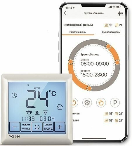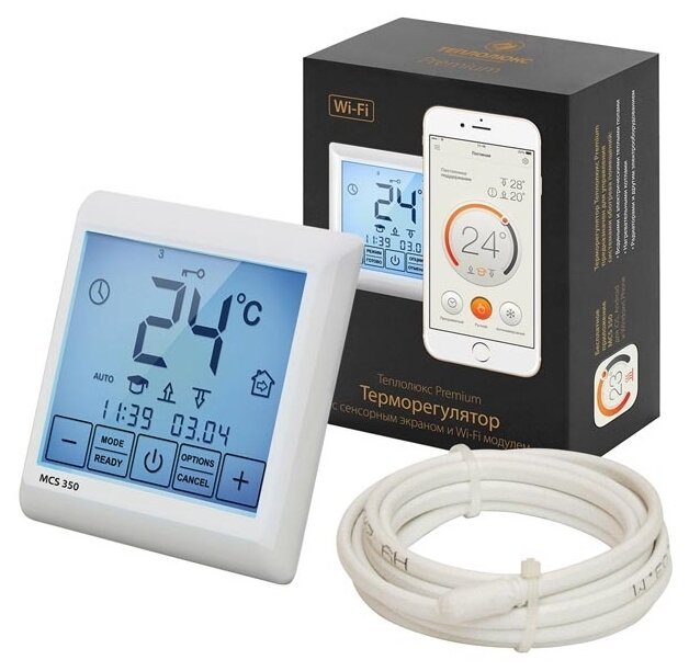 Control type: touch, maximum load: 3500 W, minimum temperature: 5 °C, maximum temperature: 45 °C, smartphone connection, air temperature control, floor heating temperature control,