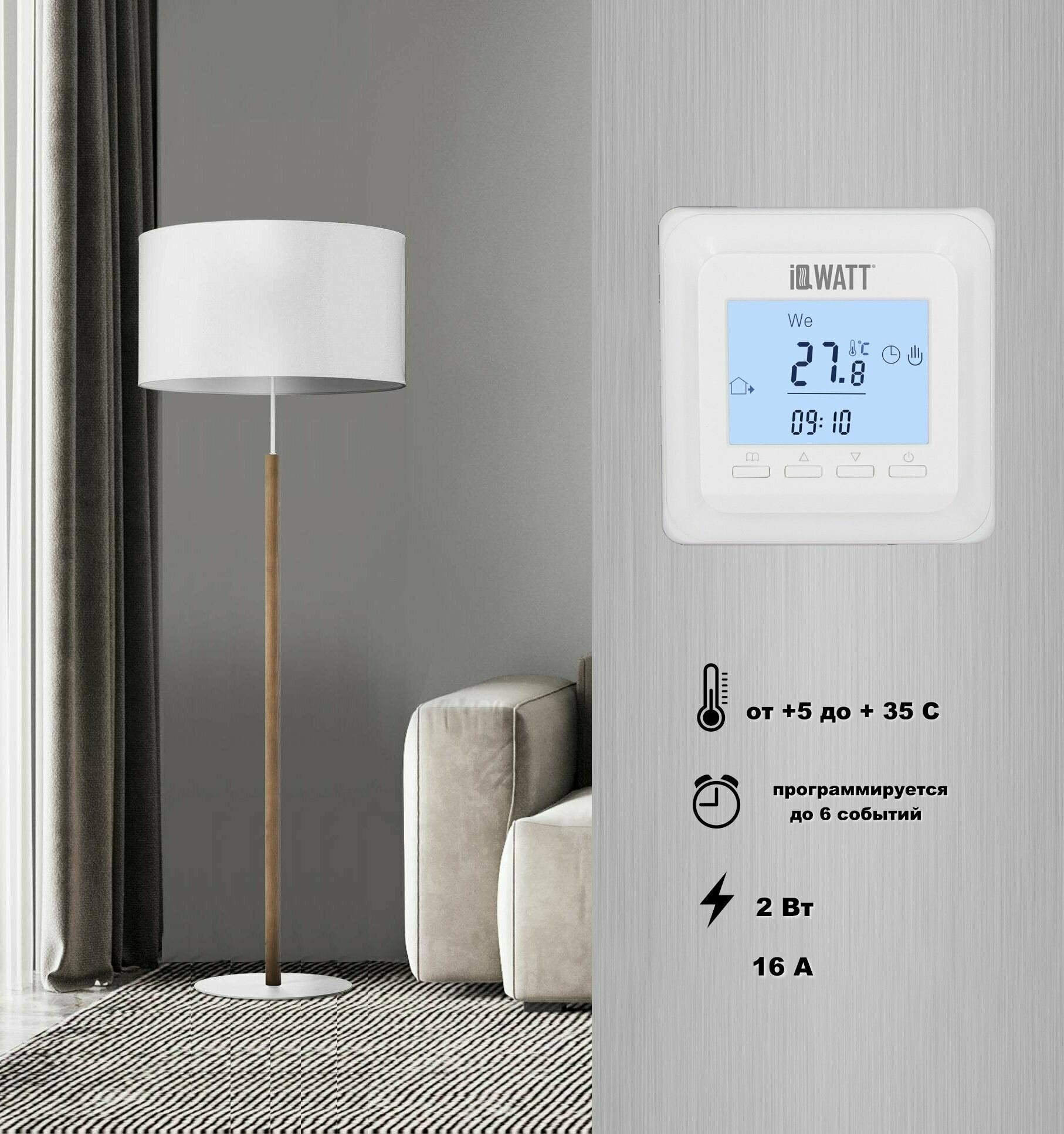 Type of control: electronic, maximum load: 3600 W, minimum temperature: 5 °C, maximum temperature: 90 °C, air temperature control, underfloor heating temperature control, underfloor heating sensor: in