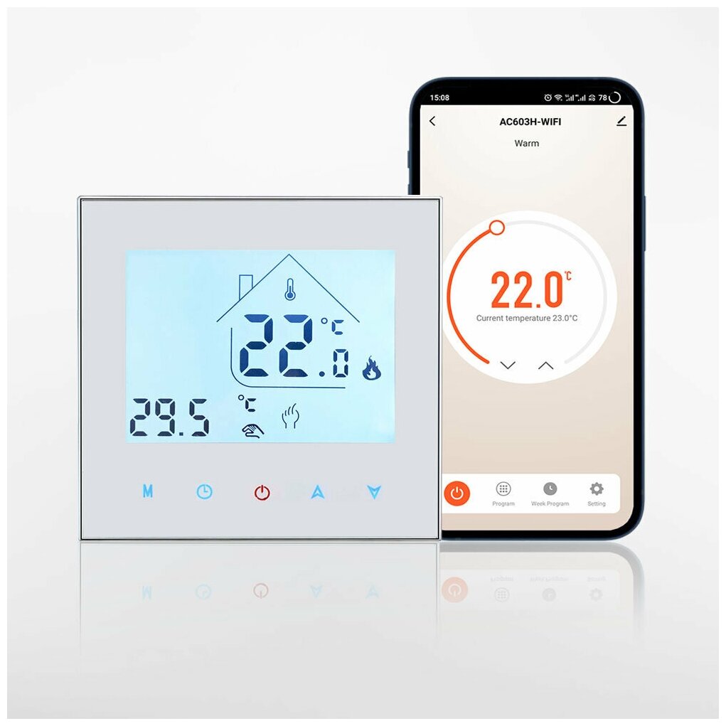 Control type: touch, maximum load: 3500 W, minimum temperature: 5 °C, maximum temperature: 90 °C, connection to a smartphone, air temperature control, floor heating temperature control,