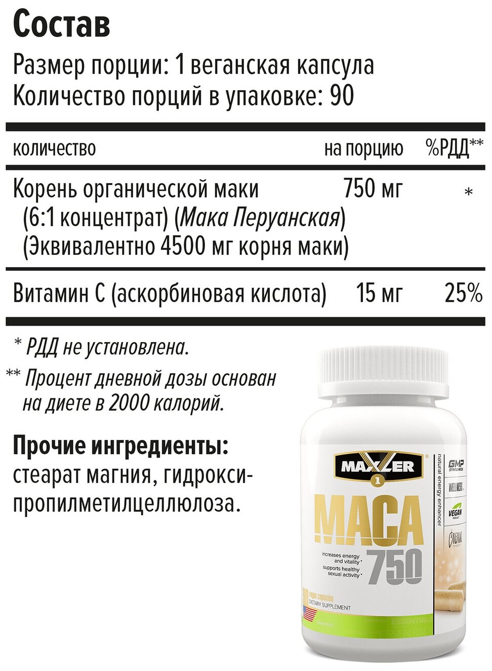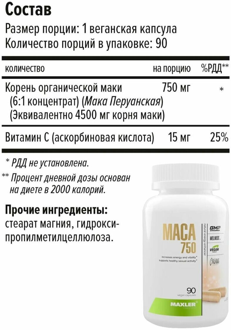 Recommendations for use: 1 capsule 1 time per day; Ingredients: Organic Maca Root, Vitamin C, Hypromellose Capsule Shell, Microcrystalline Cellulose, Vegan Magnesium Stearate, Silicon Dioxide