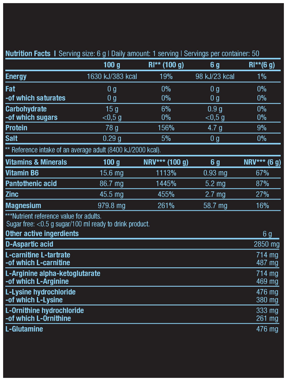 Suggested Use: Take 1 serving 6 g before bedtime = one scoop or heaping tablespoon with 200 ml of water; composition: D-aspartic acid, L-carnitine L-tartrate, L-arginine alpha-ketoglutarate, L-lysine hydrochloride