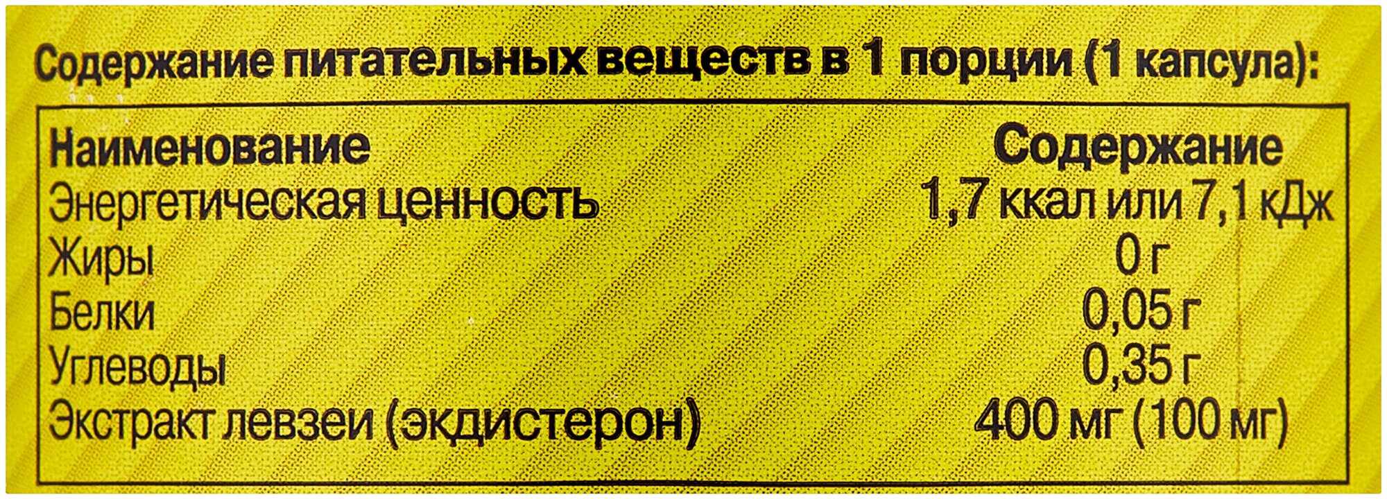 Nutritional content per serving 1 capsule: proteins 0.05 g, carbohydrates 0.35 g, leuzea extract 400 mg; energy value of 1 serving 1.7 kcal; recommendations for use: in order to gain mass and increase strength
