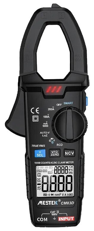 The case is made of impact-resistant plastic and is equipped with small-sized transformer clamps, a trigger, an LCD display and several inputs for connecting probes.