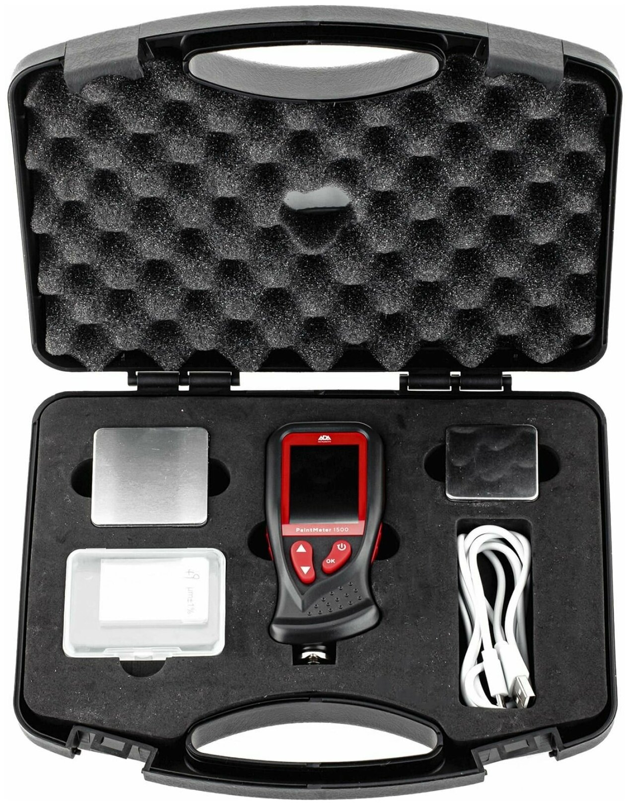Measuring principle: eddy current, maximum thickness: 1350 µm, maximum error: 3%, acoustic signal, auto-off, battery: batteries, number of batteries: 2, measuring surfaces: non-ferrous metals, �
