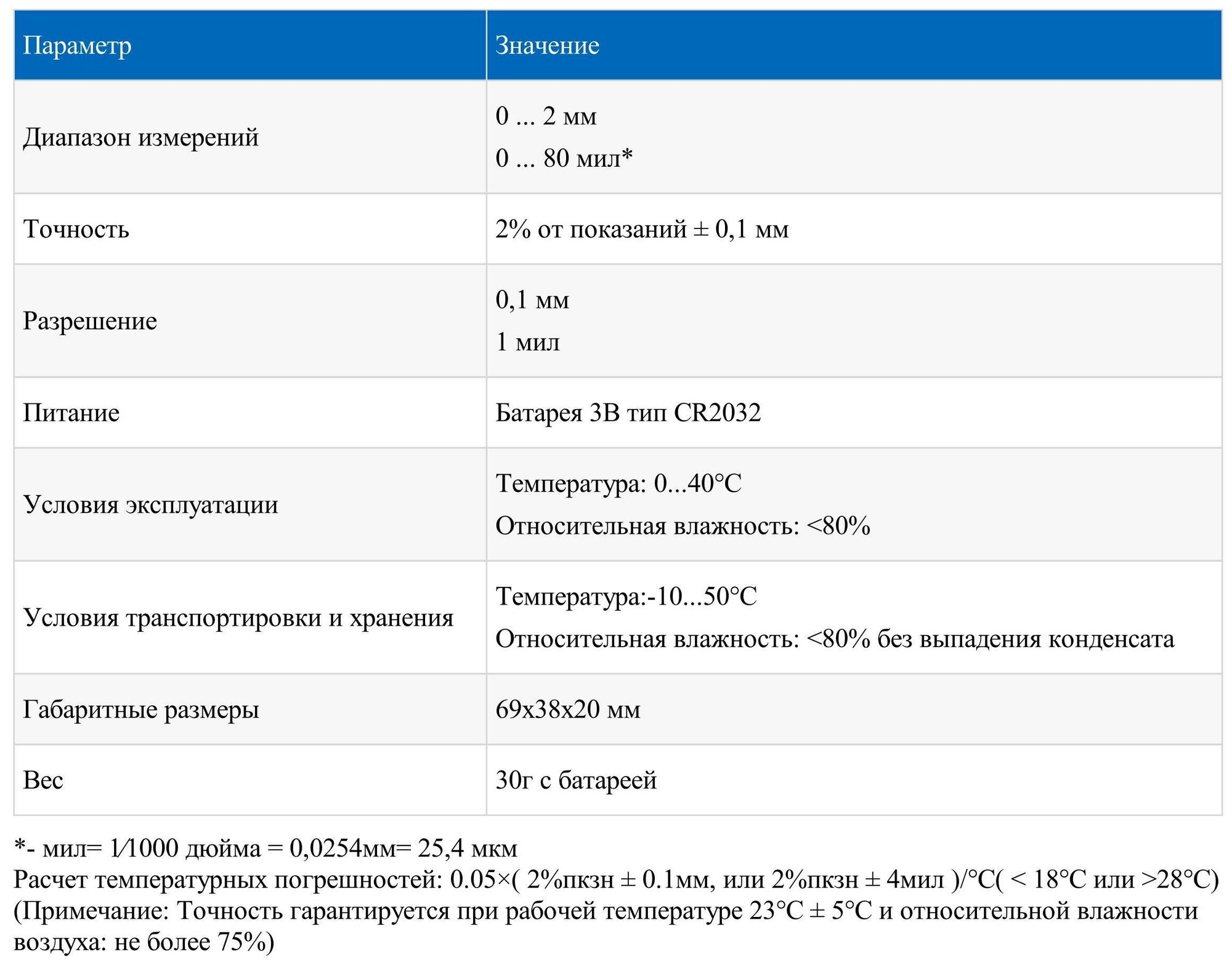Delivery set: thickness gauge - 1 pc., wrist cord - 1 pc., battery 3V type CR2032 - 1 pc., instruction manual - 1 pc.