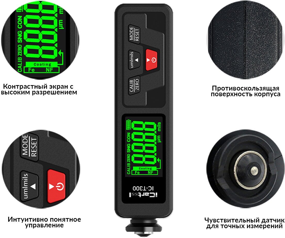 Measurement principle: electromagnetic, maximum thickness: 1500 µm, maximum error: 3%, auto-calibration, continuous measurement mode, sound signal, auto-off, battery: batteries, number of batteries
