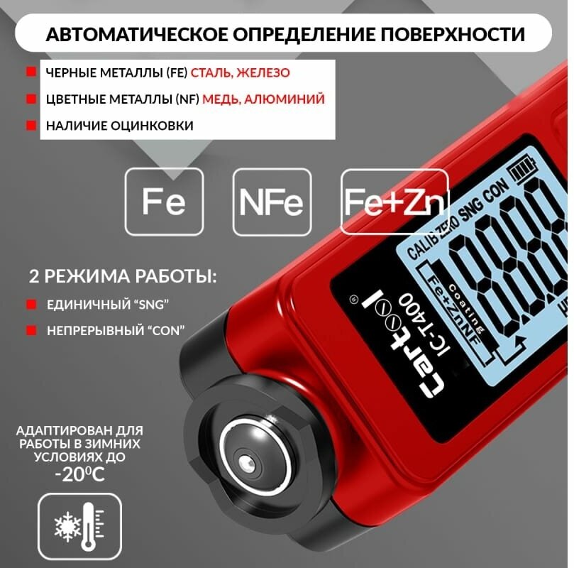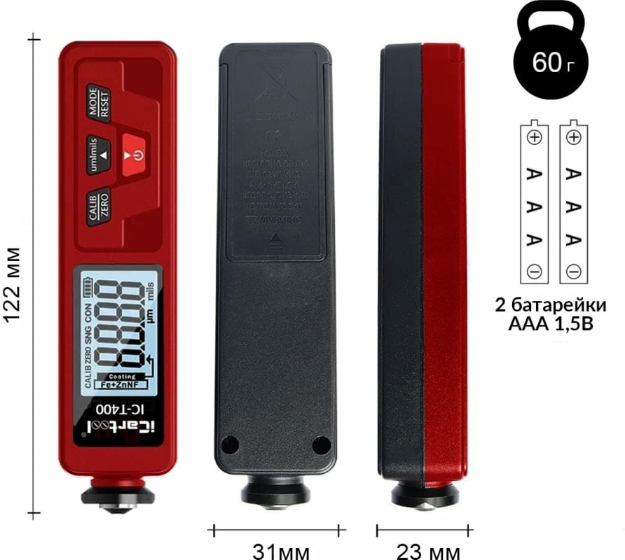 Measuring principle: eddy current, maximum thickness: 1350 µm, maximum error: 3%, acoustic signal, auto-off, battery: batteries, number of batteries: 2, measuring surfaces: non-ferrous metals, �