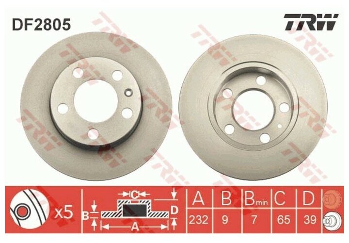 Mounting bridge: rear, disc diameter: 230 mm, center hole diameter: 65 mm, number of fixing holes: 5, hole pattern diameter: 100 mm, center part diameter: 135 mm, disc thickness: 9 mm, minimum