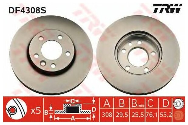 Front TRW DF4308S 308x29.5 for Volkswagen Multivan, Volkswagen Transporter, Volkswagen Touareg