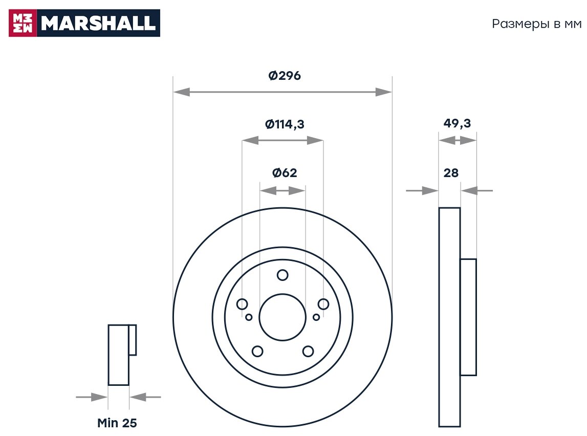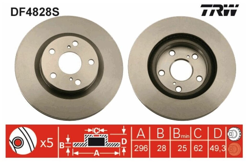Mounting bridge: front, disc diameter: 296 mm, center hole diameter: 62 mm, number of fixing holes: 5, hole pattern diameter: 114.30 mm, center part diameter: 155 mm, disc thickness: 28 mm, min.