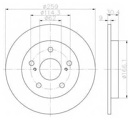 Installation bridge: rear, disc diameter: 259 mm, center hole diameter: 62 mm, number of fixing holes: 5, hole pattern diameter: 114.30 mm, center part diameter: 166 mm, disc thickness: 9 mm, thickness: 9 m