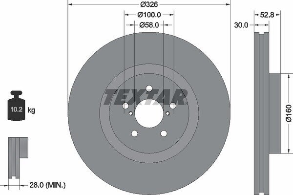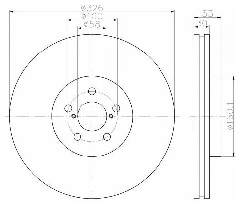 Disc diameter: 326 mm, center hole diameter: 58 mm, hole pattern diameter: 100 mm, disc thickness: 30 mm, minimum disc thickness: 28 mm, thickness: 30 mm, internal ventilation