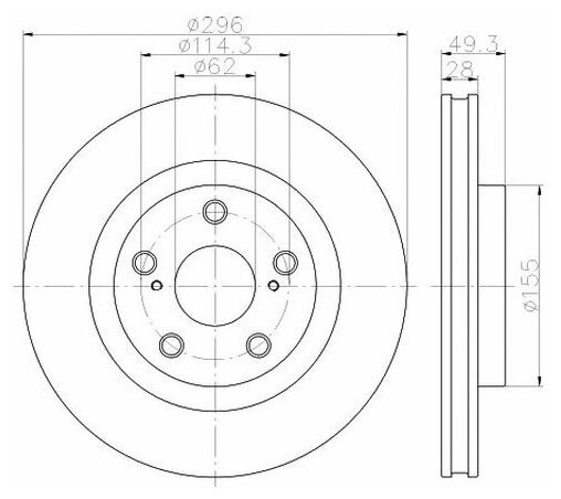 Mounting bridge: front, disc diameter: 296 mm, center hole diameter: 62 mm, hole pattern diameter: 114.30 mm, minimum disc thickness: 25 mm, internal ventilation