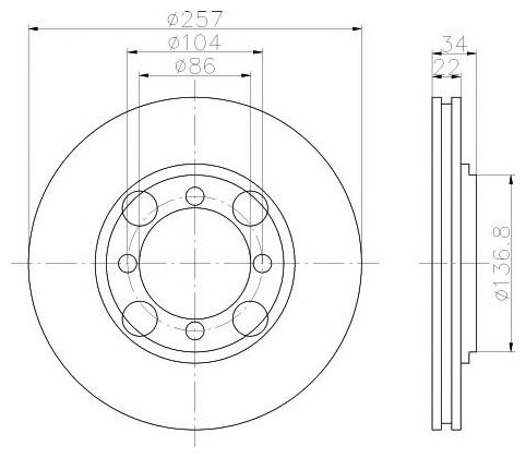 Mounting bridge: front, disc diameter: 257 mm, center hole diameter: 86 mm, number of fixing holes: 4, hole pattern diameter: 104 mm, thread diameter: 10.70 mm, center part diameter: 136.80 mm, thickness