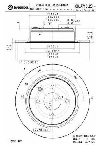 Brake rear brembo 08.A715.20 292x9 for Nissan Cube, Nissan Tiida, Nissan Versa
