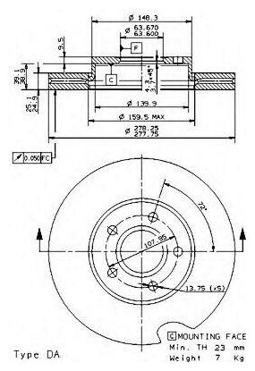 Mounting bridge: front, disc diameter: 278mm, center hole diameter: 63.50mm, number of mounting holes: 5, hole pattern diameter: 107.95mm, thread diameter: 13.80mm, center part diameter: 148.40mm, then