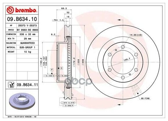 Mounting bridge: front, disc diameter: 338 mm, center hole diameter: 108 mm, number of fixing holes: 6, hole pattern diameter: 139.70 mm, thread diameter: 14.55 mm, center part diameter: 183.20 mm, thickness