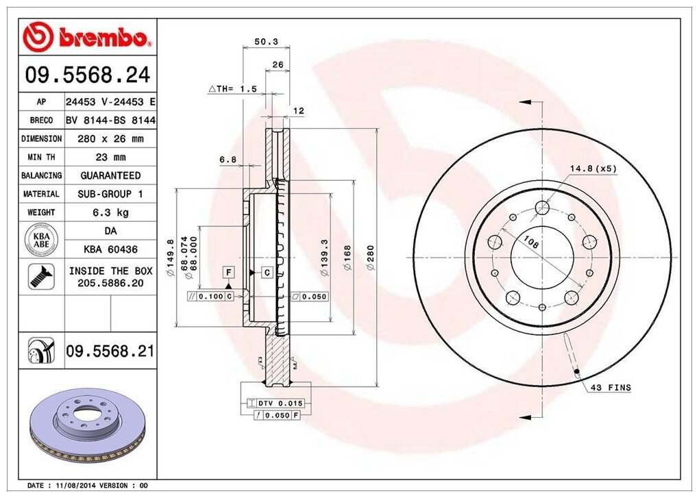 Mounting bridge: front, disc diameter: 280 mm, center hole diameter: 68 mm, number of fixing holes: 5, hole pattern diameter: 108 mm, thread diameter: 14.80 mm, center part diameter: 149.80 mm, thickness