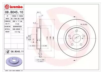 Brake rear brembo 08.B045.10 290x11 for Toyota Avensis