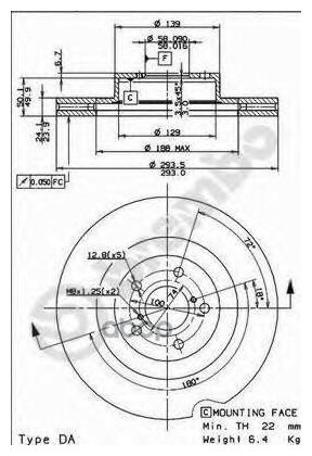 Mounting bridge: front, disc diameter: 293 mm, center hole diameter: 58 mm, number of fixing holes: 5, hole pattern diameter: 100 mm, thread diameter: 12.75 mm, center part diameter: 129.20 mm, thickness