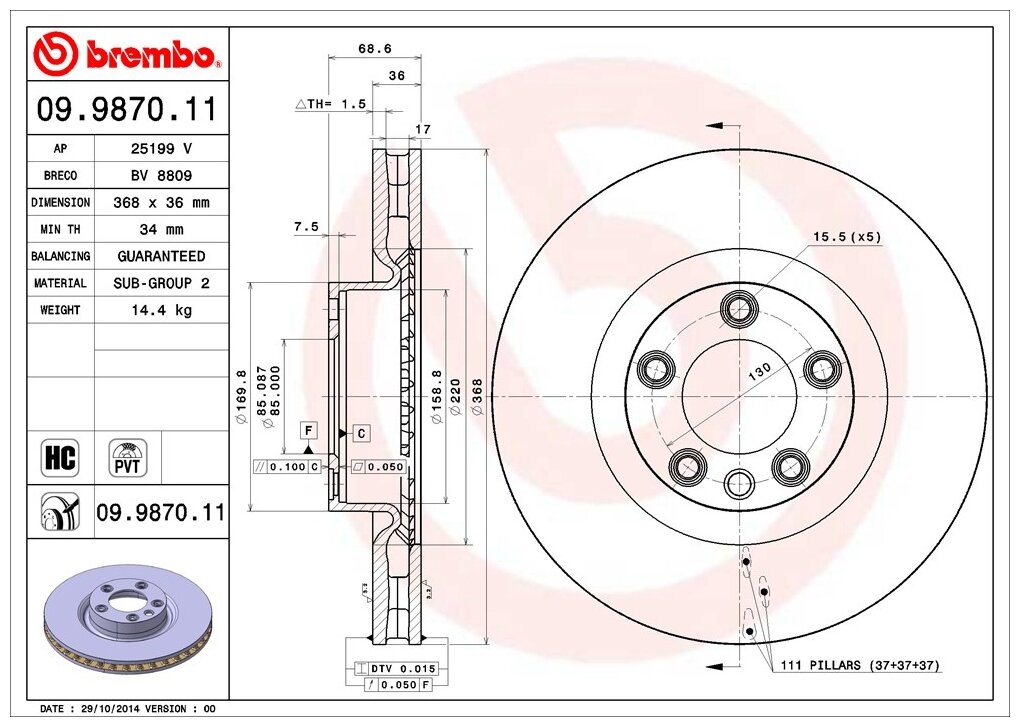 Mounting bridge: front, disc diameter: 368 mm, center hole diameter: 85 mm, number of fixing holes: 5, hole pattern diameter: 130 mm, thread diameter: 15.50 mm, center part diameter: 169.80 mm, thickness