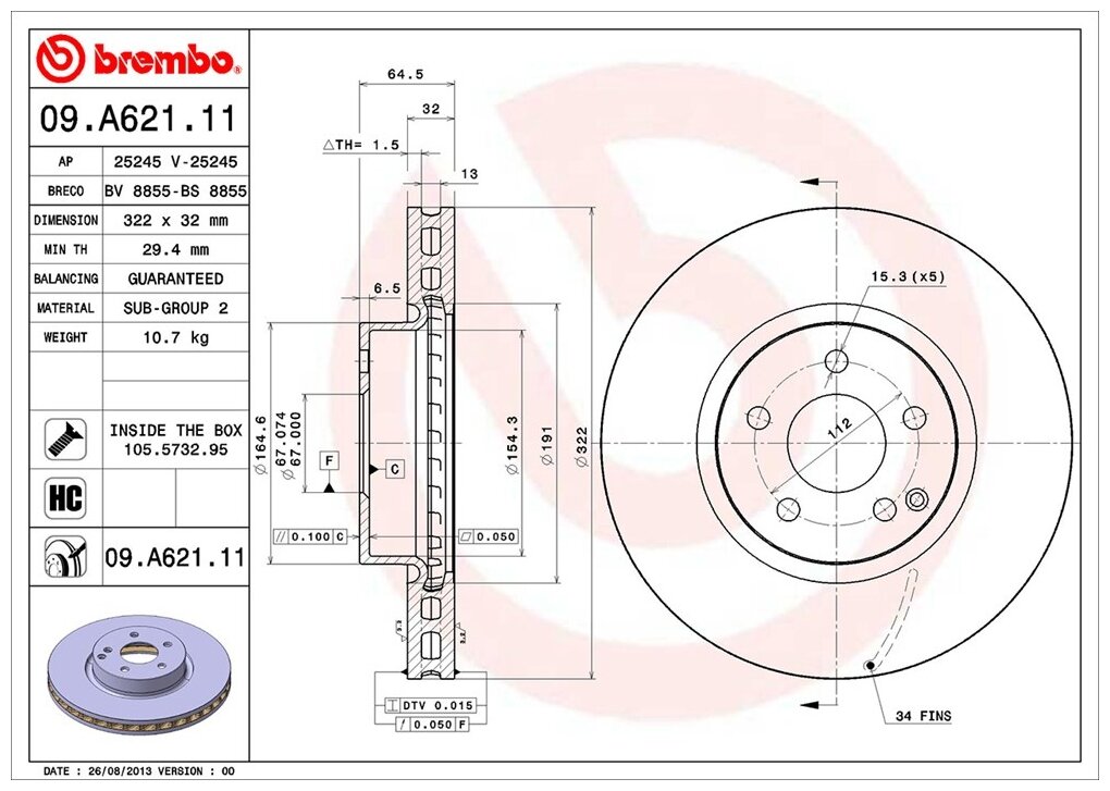 Installation bridge: front, disc diameter: 322 mm, center hole diameter: 67 mm, number of mounting holes: 5, disc thickness: 32 mm, minimum disc thickness: 29.40 mm, thickness: 32 mm, internal ventilation, acc.